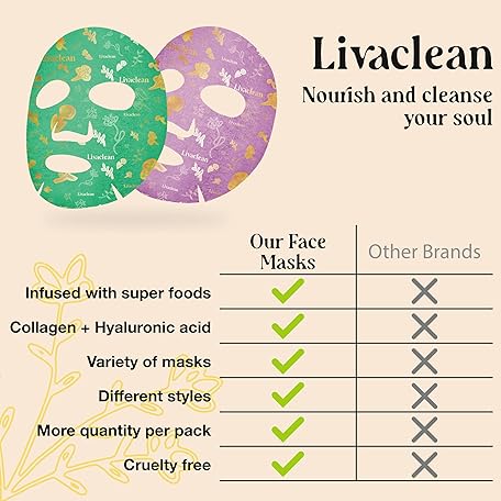 Thông tin sản phẩm LivaClean 12 CT Face Masks Skincare - Collagen Sheet Mask - Hydrating Face Masks Bulk with Glycerin, Hyaluronic Acid, Aloe Vera - Soothing, Refreshing, Moisturizing Formula for All Skin Types