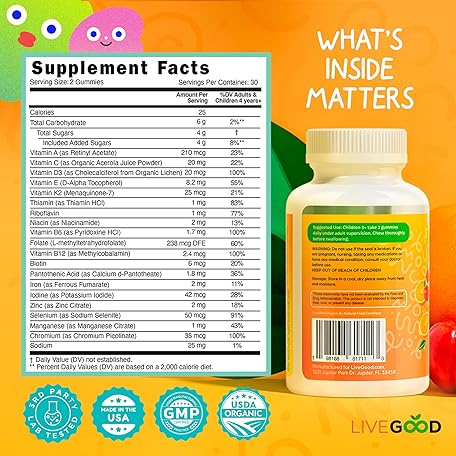 LIVEGOOD Organic Childrens Multivitamin Gummies, Chewable Daily Supplement with Vitamin C & Zinc for Kids, Citrus Flavor, 60 Gummies