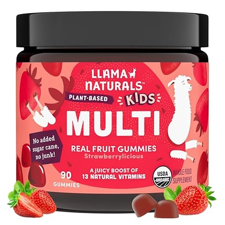Thông tin sản phẩm Llama Naturals Kids Multivitamin Gummies, Vegan, Organic with Vitamin D, C & K, Toddler Real Fruit Gummy Vitamins, Chewable Supplement, Whole Food Multivitamin, No Added Sugar Cane, Strawberry, 90 Ct