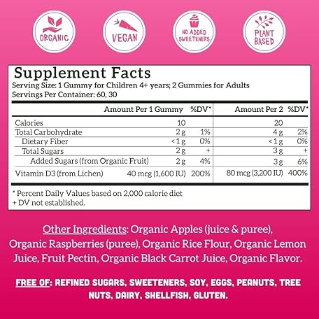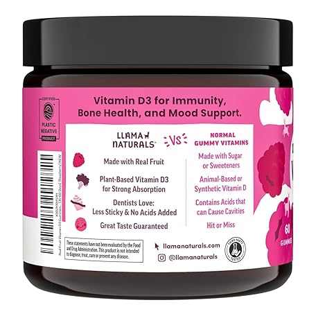 Thông tin sản phẩm Llama Naturals Vitamin D3, Vegan, Organic Immune Support Supplement, Vitamin D Gummies for Adults and Kids, Real Fruit Gummy Vitamins, Promotes Bone Health, No Added Sugar Cane, Raspberry, 60 Ct
