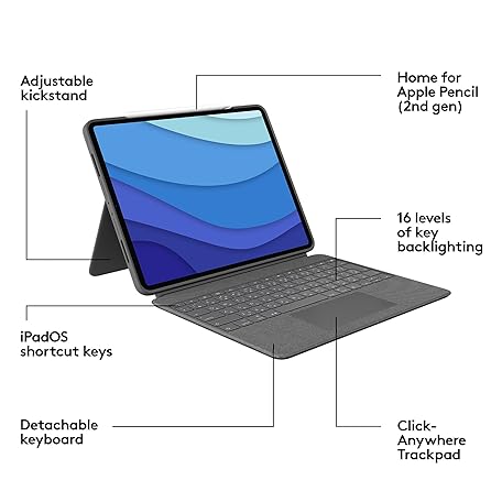 Thông tin sản phẩm Logitech Combo Touch iPad Pro 12.9-inch (5th, 6th gen - 2021, 2022) Keyboard Case - Detachable Backlit Keyboard with Kickstand, Click-Anywhere Trackpad, Smart Connector - Oxford Gray; USA Layout