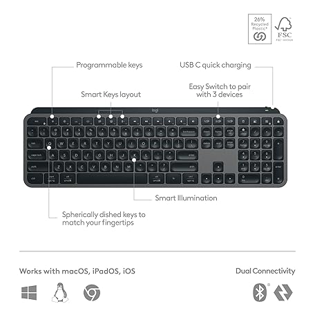Thông tin sản phẩm Logitech MX Keys S Wireless Keyboard, Low Profile, Fluid Precise Quiet Typing, Programmable Keys, Backlighting, Bluetooth, USB C Rechargeable, for Windows PC, Linux, Chrome, Mac - Graphite