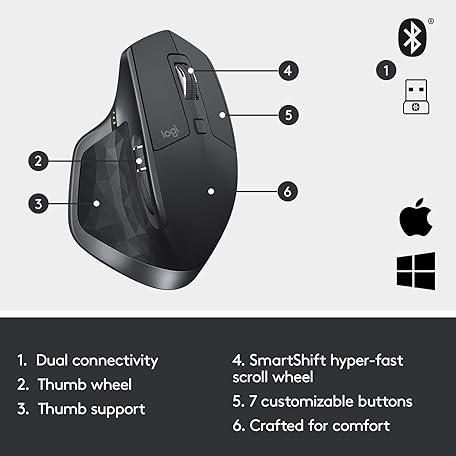 Thông tin sản phẩm Logitech MX Master 2S Wireless Mouse, Multi-Device, Bluetooth or 2.4GHz Wireless with USB Unifying Receiver, 4000 DPI Any Surface Tracking, 7 Buttons, Fast Rechargeable, Laptop/PC/Mac/iPad - Graphite