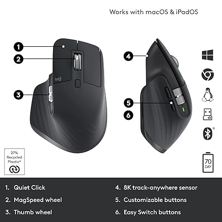 Thông tin sản phẩm Logitech MX Master 3S Wireless Mouse Standard Edition with Logi Bolt USB Receiver, Ultra-fast Scrolling, Ergo, 8K DPI, Track on Glass, Quiet Clicks, USB-C, Bluetooth, Windows, Linux, Chrome - Graphite