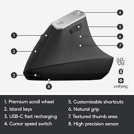 Thông tin sản phẩm Logitech MX Vertical Wireless Mouse – Ergonomic Design Reduces Muscle Strain, Move Content Between 3 Windows and Apple Computers, Rechargeable, Graphite
