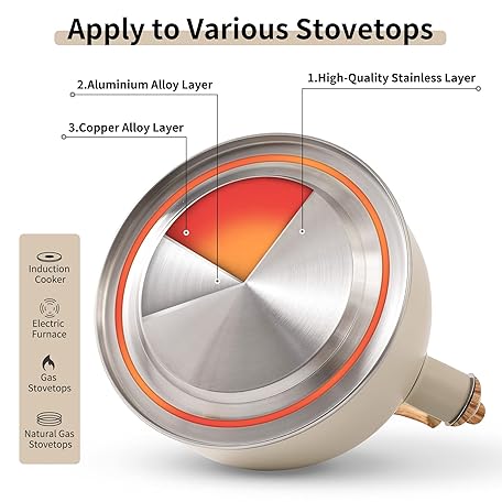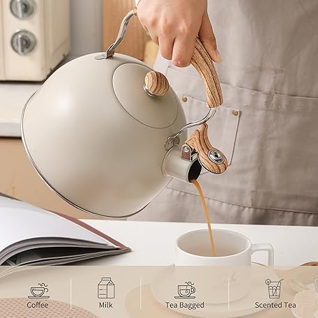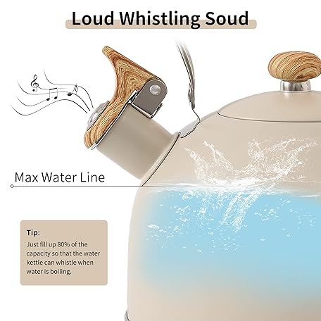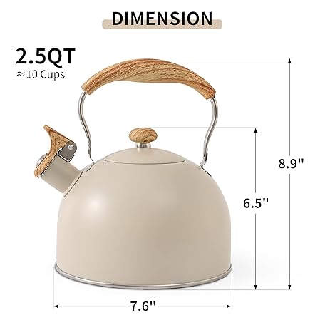 Thông tin sản phẩm LONFFERY Tea Kettle for Stove Top, 2.5 Quart Whistling Tea Kettle, with Food Grade Stainless Steel and Wood Pattern Folding Handle, Creamy White