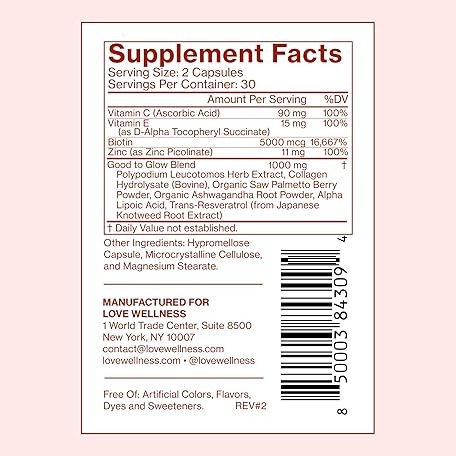 Sản phẩm Love Wellness Good to Glow | Collagen Supplement with Biotin, Vitamin C, E, Ashwagandha & Zinc | Promotes Smooth, Glowing & Clear Skin | Enhances Smoothness & Promotes Healthy Skin | 60 Count đang được bán với giá ưu đãi là $27.2391 tại nước Mỹ.