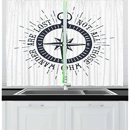 Lunarable Not All Who Wander are Lost Long Kitchen Curtains, Compass and Wind Rose Nautical Theme Voyage Words, 2 Panel Set Drapes with Rod Pocket Room Decor, 55" x 45", Slate Blue and White
