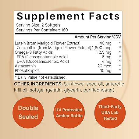 Thông tin sản phẩm Lutein 40mg + Zeaxanthin 1,600mcg, 360 Softgels | 4-in-1 Formula with Astaxanthin, Omega-3 & Phospholipids | Marigold Flower Extract | Supports Eye, Brain & Vision Health | Non-GMO, Gluten Free
