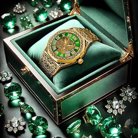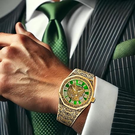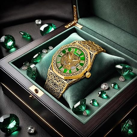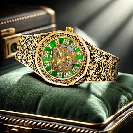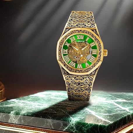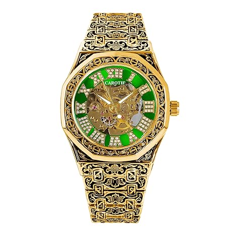 Luxury Automatic Mechanical Watch, Gold-Plated Skeleton Dial with Blue Accents, 42mm Case, Crystal Rhinestone Roman Numerals, Vintage Carved Pattern Band