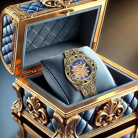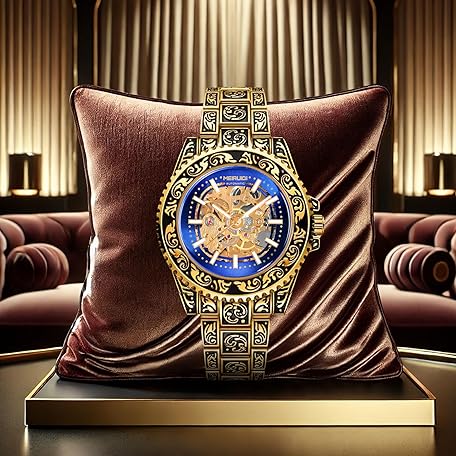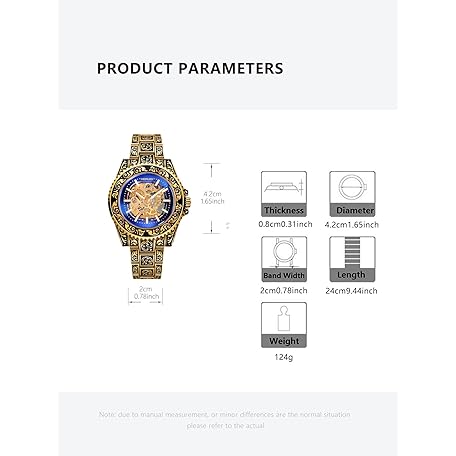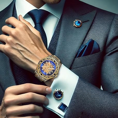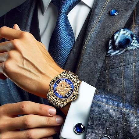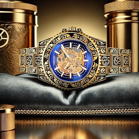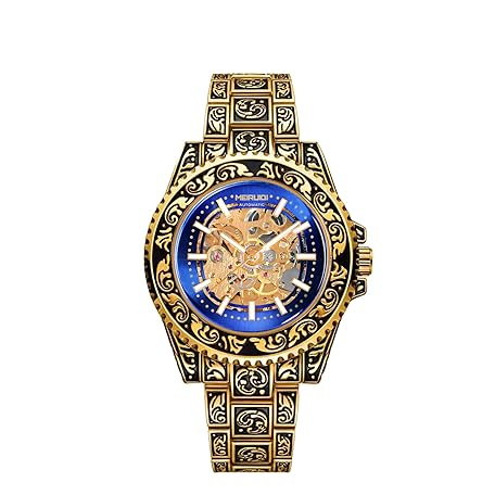 Luxury Automatic Mechanical Watch, Gold-Tone Carved Pattern, Skeleton Dial, 42mm Case