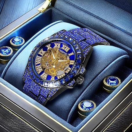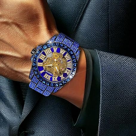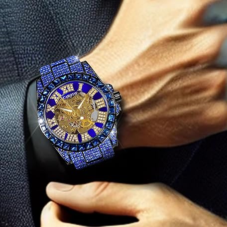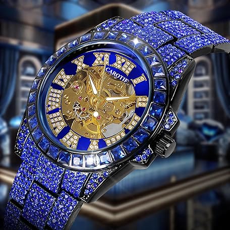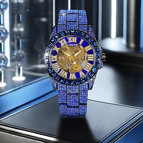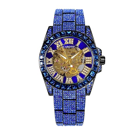 Luxury Mechanical Watch, Blue Crystal Studded Band, Skeleton Dial Display, Black