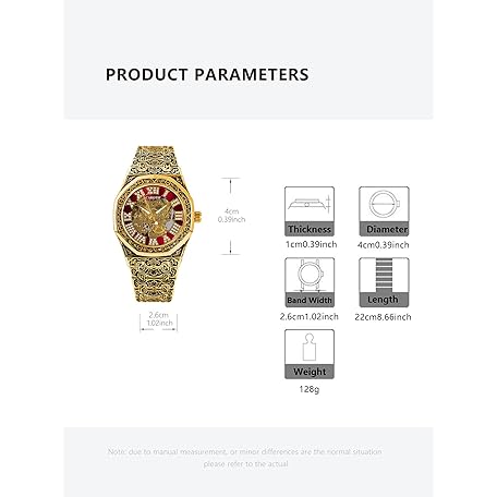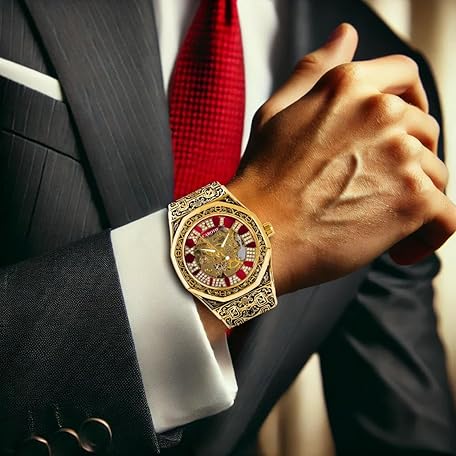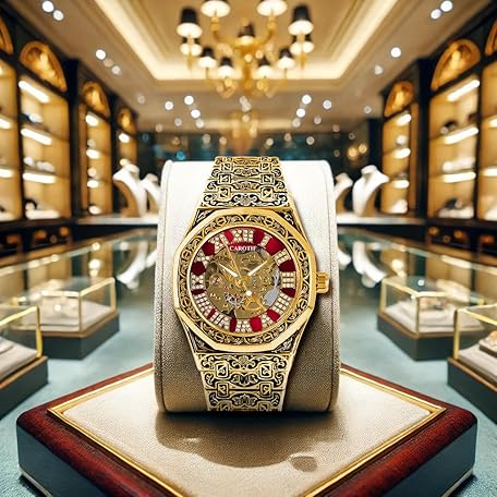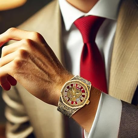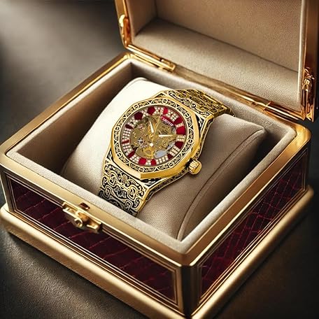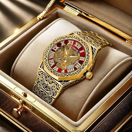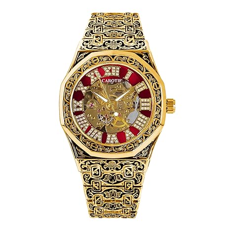 Luxury Mechanical Watch, Gold-Tone Skeleton Dial with Red Accents, Ornate Band with Vintage Design