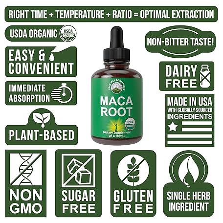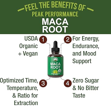Thông tin sản phẩm Maca Root Liquid Drops. USDA Organic Vegan Extract Supplement For Women and Men. High Bioavailability Supplements. Maca For Energy, Endurance, and Mood Support. Zero Sugar, Gluten Free, No Capsules