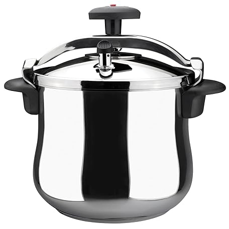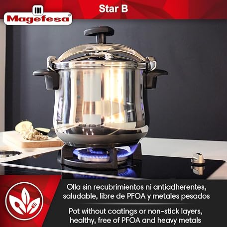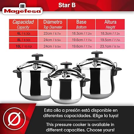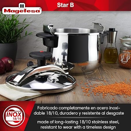 Thông tin sản phẩm MAGEFESA Star Belly Pressure Cooker 10.6 Qt – 18/10 Stainless Steel, Rounded Bottom, 3 Safety Systems, Works on All Stovetops Including Induction, 8 PSI