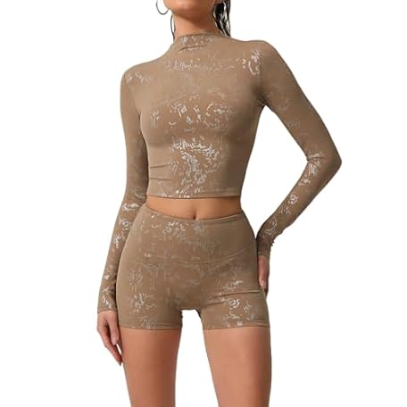 Maizoon Gym Sets for Women 2 Piece Stylish Yoga Set with Long Sleeve & Sports Shorts Silver Pattern Activewear