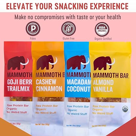• Mammoth Bar Variety Pack – 10 Organic Protein Bars – Prebiotic • Paleo • Gluten Free • Egg Protein • GMO Free • Raw • Premium Nuts