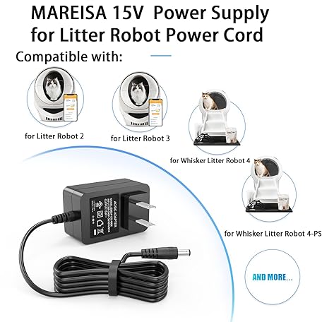 Thông tin sản phẩm MAREISA 15V DC Power Supply, 15Volt Power Adapter Compatible with Litter Robot 2, 3, 4 Open Air Self Cleaning Cat Litter Box