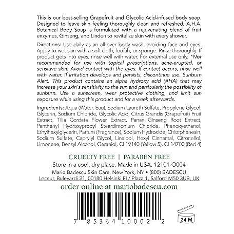 Thông tin sản phẩm Mario Badescu AHA Botanical Body Wash Moisturizing, Clarifying and Gentle Exfoliating Wash for Brighter, Softer and Smoother Skin, Body Soap Infused with Glycolic Acid & Fruit Enzymes