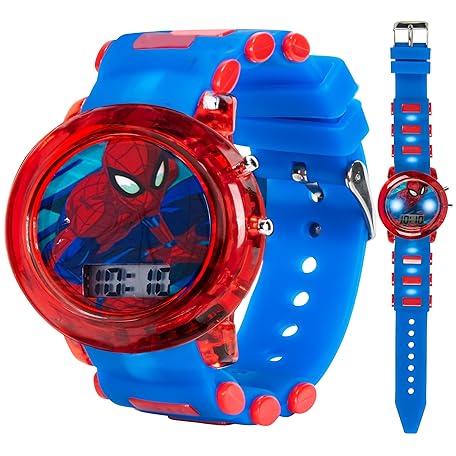 Thông tin sản phẩm Marvel Spider-Man Kids' LCD Watch – Flashing LED Bullet Band, Digital Time Display, Red & Blue Design, Durable Plastic Case, Adjustable Silicone Strap – Fits Wrists 5.5" to 8"