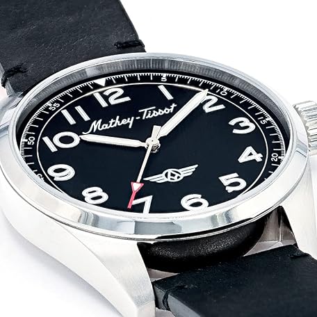 Thông tin sản phẩm Mathey-Tissot Men's Heritage Swiss Quartz Watch – 42mm Stainless Steel Case with Black Dial and Silver Indexes, Three-Hand Analog Display, Black Leather Strap