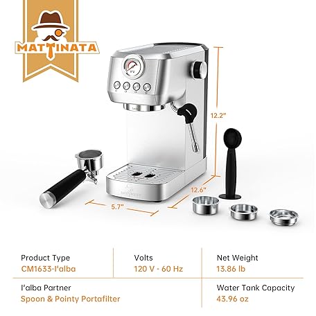 Sản phẩm MAttinata Espresso Machine 20 Bar, Espresso Coffee Maker with Professional Milk Frother Steam Wand for Cappuccino & Latte, 49oz Removable Water Tank for Home, Stainless Steel đang được bán với giá ưu đãi là $119.8891 tại nước Mỹ.