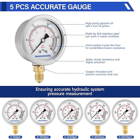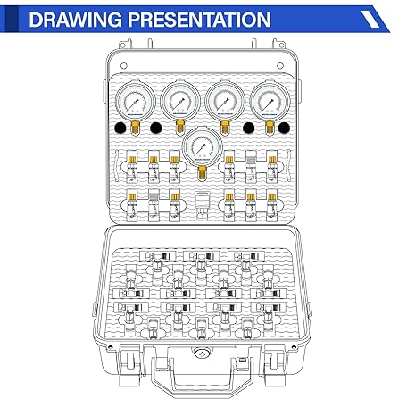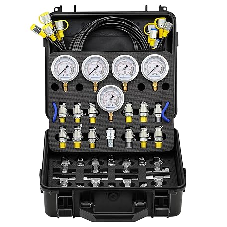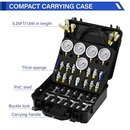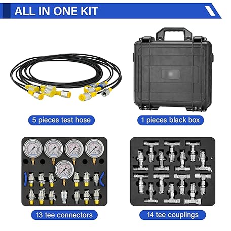 MEASUREMAN Hydraulic Pressure Test Kit with 5 Gauges (10/100/280/400/700bar, Max 10000psi/60Mpa), 13 Test Couplings, 14 Tee Connectors, 5 Test Hoses, for Excavator and Construction Machinery