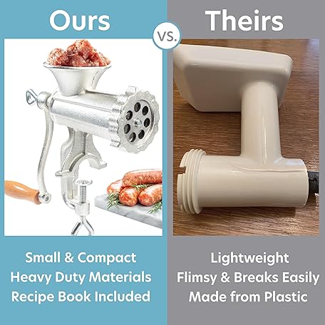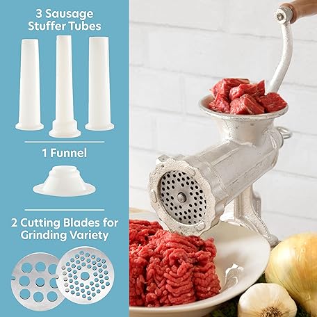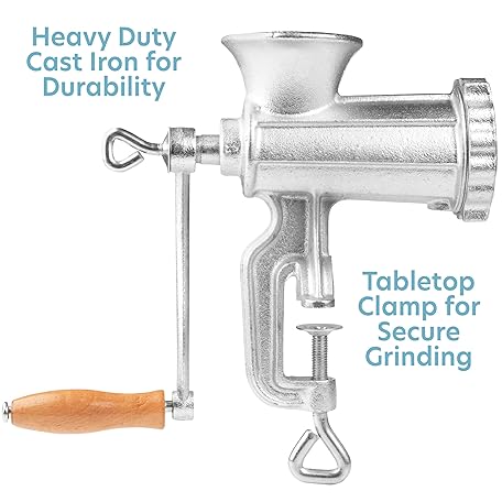 Thông tin sản phẩm Meat Grinder w Tabletop Clamp & 2 Cutting Disks, Cast Iron Heavy Duty Sausage Maker & Manual Meat Mincer- Homemade Burger Patties, Ground Beef & More, Portable Holiday Cooking, Kitchen Essential Gift