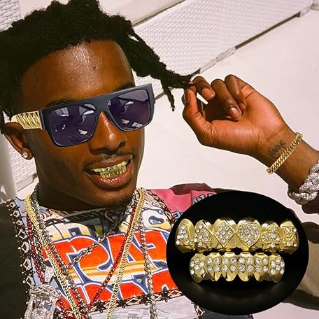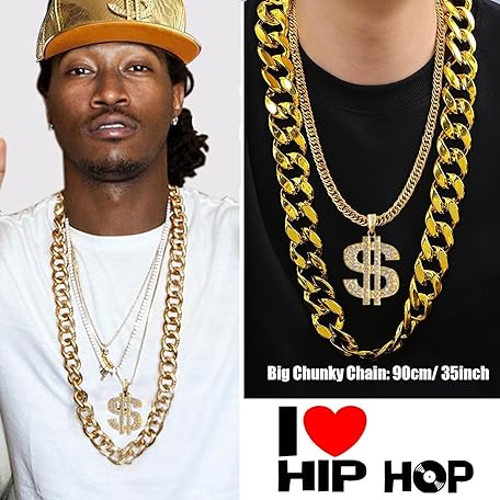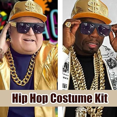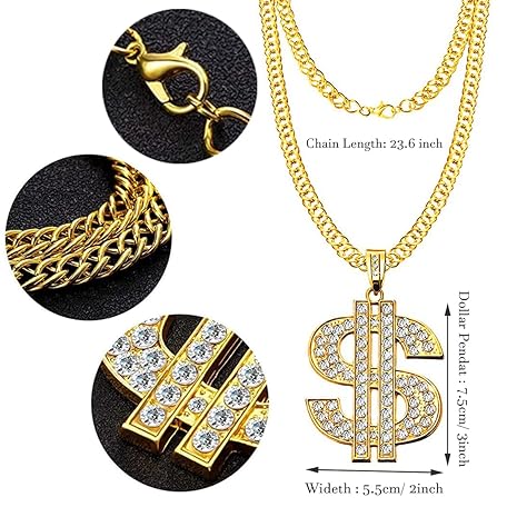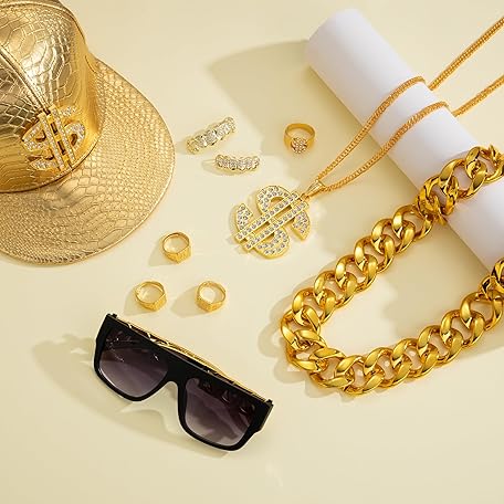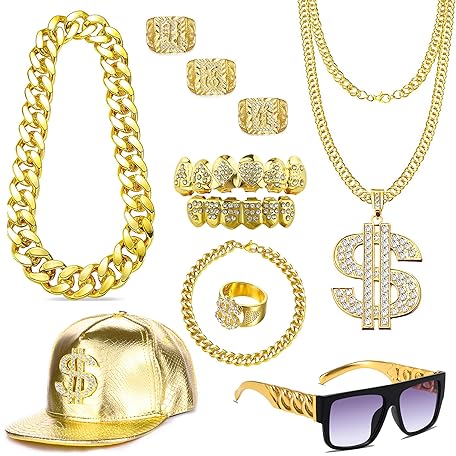 Sản phẩm MEDOJO 80 90s Hip Hop Costume Outfit Kit Fake Golden Chain Dollar Sign Cap CZ Grillz Teeth Rapper Accessories Set đang được bán với giá ưu đãi là $20.6991 tại nước Mỹ.
