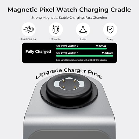 Meifigno Watch Charger Stand for Pixel Watch 3/2/Fitbit Versa 4/3/sense 2/Sense (Not for Pixel Watch1/4), 3 in 1 Aluminum Alloy Pixel Charger Designed for Google Pixel 10 Pro XL/9/9a/8/7, for Buds