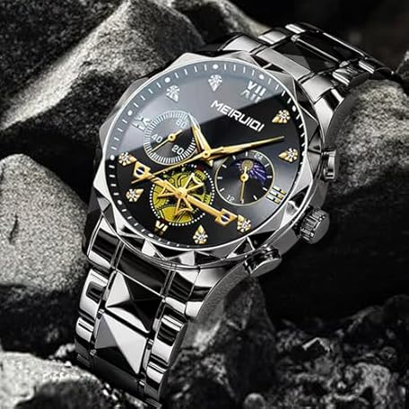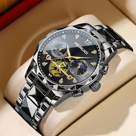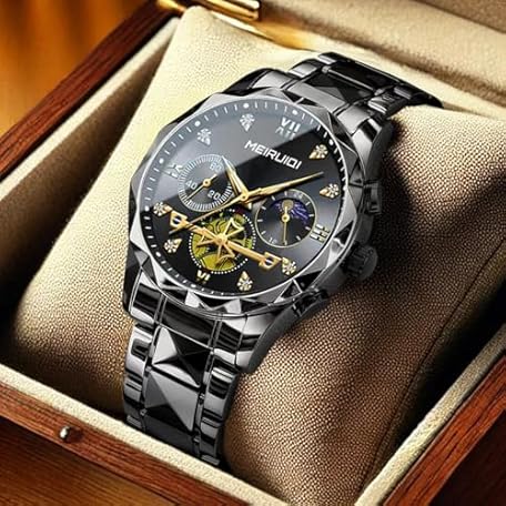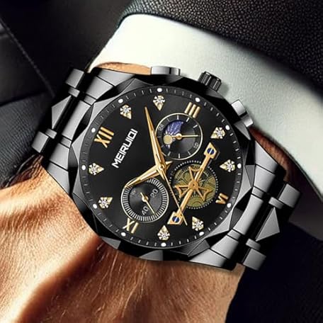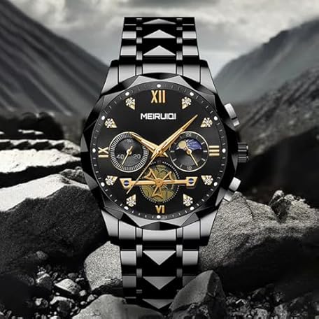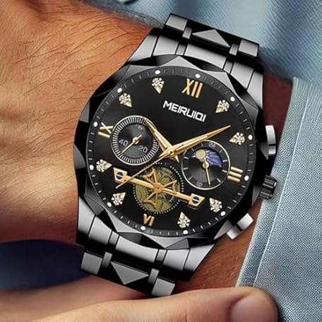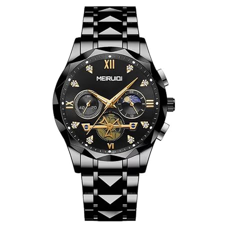 MEIRUIQI Men's Luxury Watch, Black Stainless Steel Band, Moon Phase Display, Gold Roman Numerals