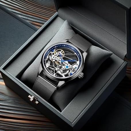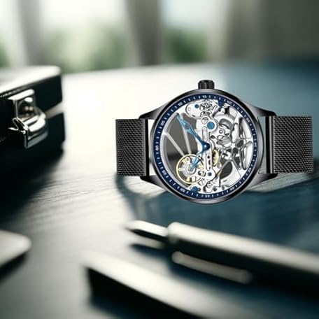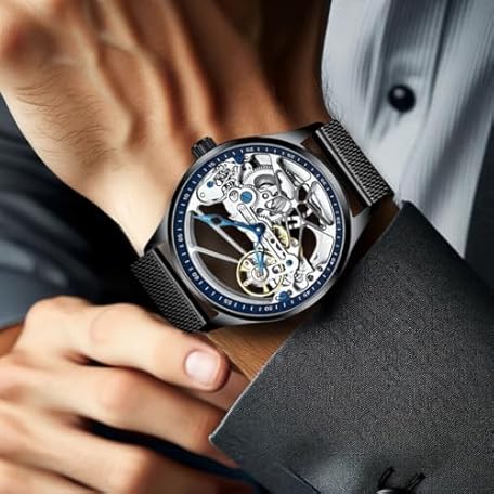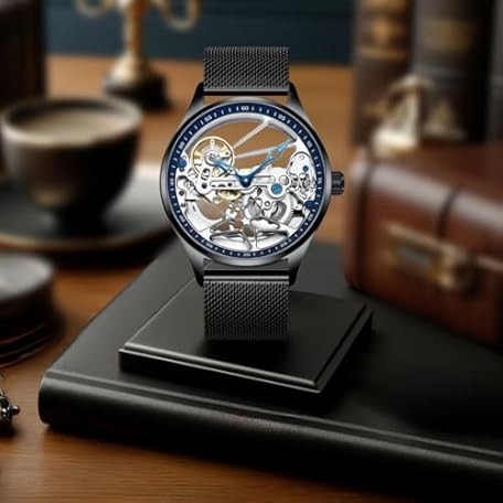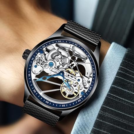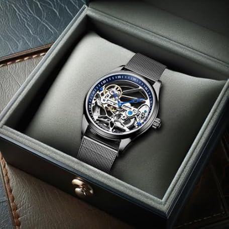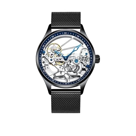 Men's Skeleton Mechanical Watch, Black Mesh Band, Blue Bezel, Transparent Dial,Precise Mechanical Structure,Automatic Winding of Watch