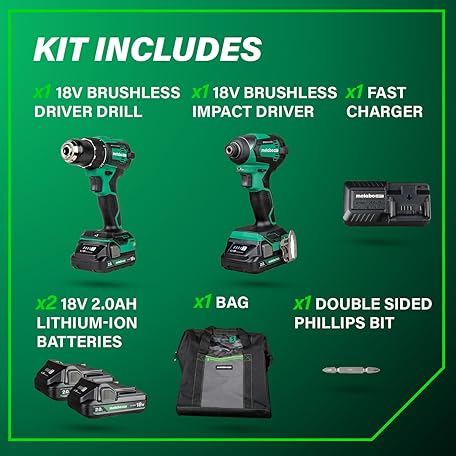 Thông tin sản phẩm Metabo HPT 18V MultiVolt Cordless Brushless Driver Drill & Impact Driver Combo Kit, Power Tool Kit, 2 Lithium-Ion Metabo HPT Batteries and Charger, High Torque, Compact Lightweight Design, KC18DEXQB