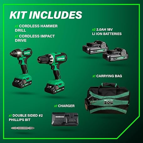 Thông tin sản phẩm Metabo HPT 18V MultiVolt Cordless Hammer Drill and Impact Driver Combo Kit, Cordless Power Tool Set with 2 Lithium-Ion Batteries and Charger, Lightweight and Ergonomic Design, Carrying Bag, KC18DFX