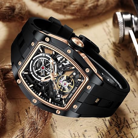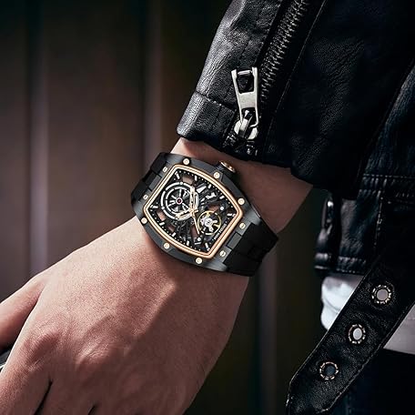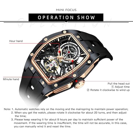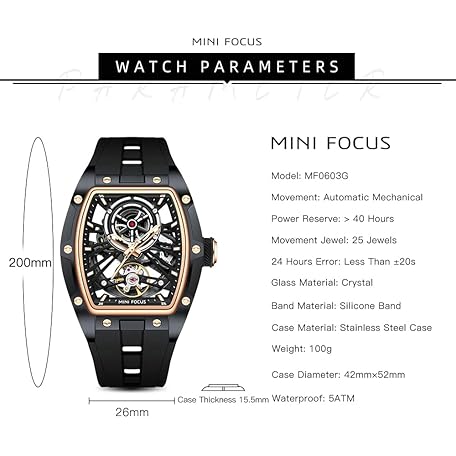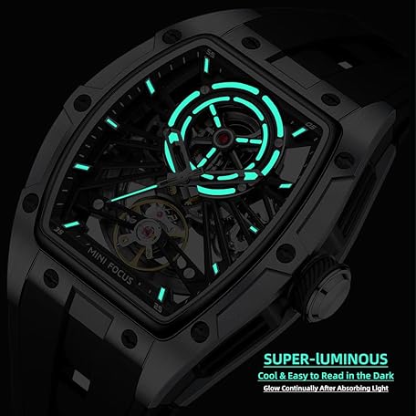 Thông tin sản phẩm MF MINI FOCUS Unique Men Watches,Automatic Mechanical Watch,Luxury Hollow Tonneau Watches for Men with Stainless Steel Case and Silicon Band (Self-Wind Movement/5ATM Waterproof/Super_Luminous)