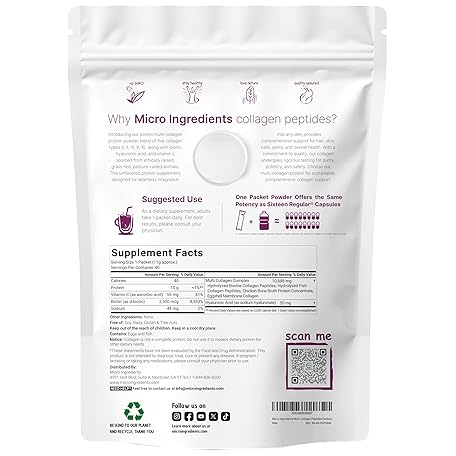 Thông tin sản phẩm Micro Ingredients Multi Collagen Peptides Powder, 40 Stick Packs | Type I, II, III, V, X + Biotin, Vitamin C & Hyaluronic Acid | Unflavored | Supports Hair, Skin & Joint Health | Keto, Non-GMO