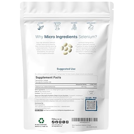 Micro Ingredients Selenium Supplements for Women & Men 200mcg, 500 Softgels with Coconut Oil | Essential Trace Mineral as Selenomethionine | Antioxidant for Energy, Heart, & Immune Support