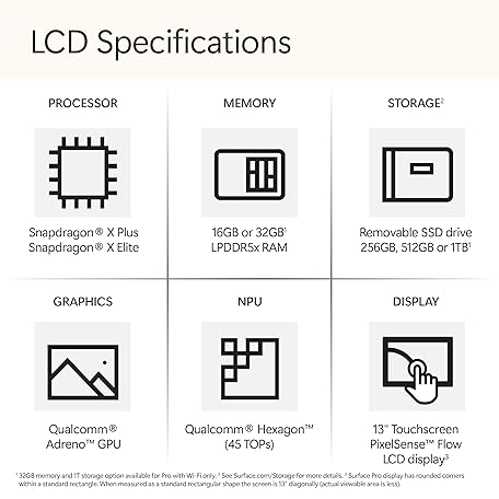 Thông tin sản phẩm Microsoft Surface Pro 2-in-1 Laptop/Tablet (2024), Windows 11 Copilot+ PC, 13" Touchscreen LCD Display, Snapdragon X Plus (10 Core), 16GB RAM, 256GB Storage, 5G Connectivity, Platinum