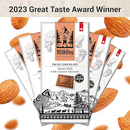 Thông tin sản phẩm Milkboy Swiss Chocolates Almond Chocolate Bars - Premium Swiss Alpine Milk Chocolate with Almonds - All Natural, Gluten-Free, Non-GMO - Made in Switzerland, Kosher - 3 oz, Pack 2