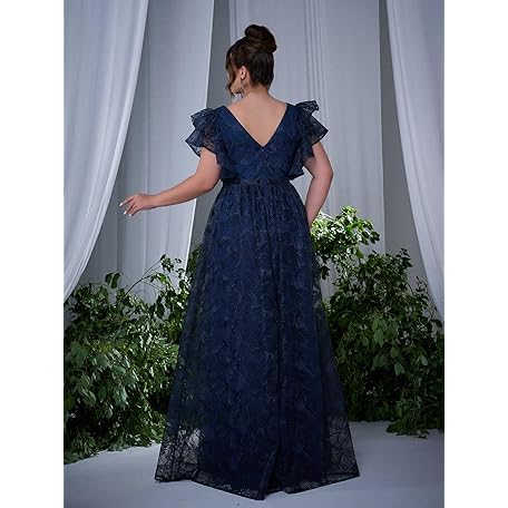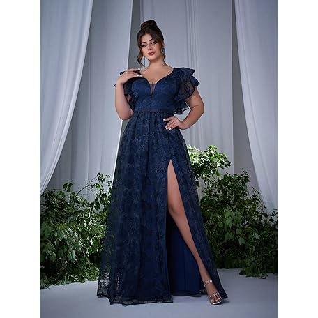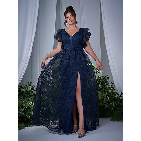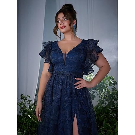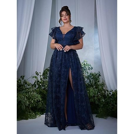 • MIMIFINA Women's Plus Size V Neck Ruffled Sleeve Embroidered Lace Maxi Dress with High Slit Formal Evening Gown for Weddings