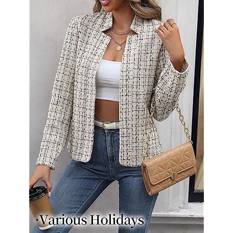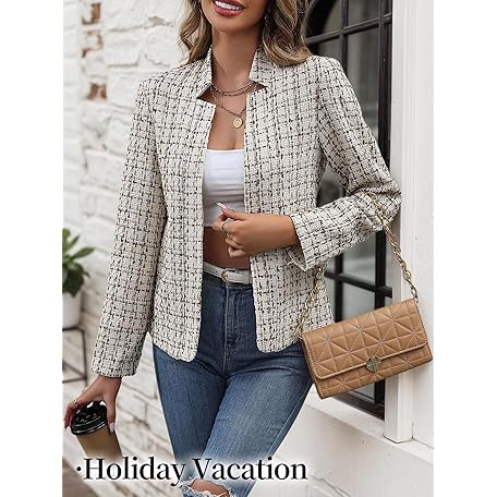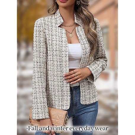 • Mina Self 2025 Fall Women's Tweed Plaid Blazer Jacket - Warm Open Front Stand Collar Fully Lined Casual Fashion Work Coat