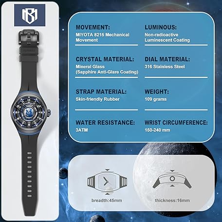 Thông tin sản phẩm MINBER Skeleton Automatic Watch, 45mm Dial with Luminous Hands, Self Winding Watch, 3 ATM Waterproof, 316L Stainless Steel