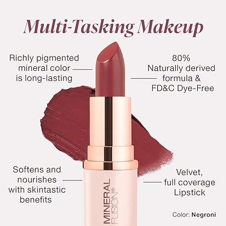 Thông tin sản phẩm Mineral Fusion Long-Lasting Lipstick, Vivid & Smudge-Free Lip Color with Avocado Oil, Cocoa Seed Butter, Free of FD&C Dyes, Paraben and Gluten, Negroni