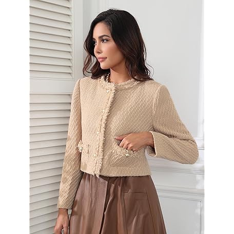 • M.Infisavo Tweed Blazer Jackets for Womens with Pockets, Cropped Long Sleeve Open Front Collarless Elegant Casual Cardigan