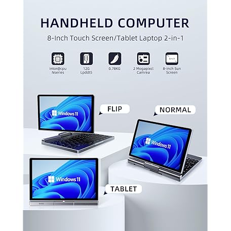 Thông tin sản phẩm Mini Laptop 8 inch HD Touchscreen Portable, Windows 11 Pro Small Gaming Laptop, N100 12 GB LPDDR5 512 GB M.2 SSD, Wi-Fi 6, BT 5.2 2 MP Camera, G-Sensor, HDMI, Type C