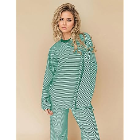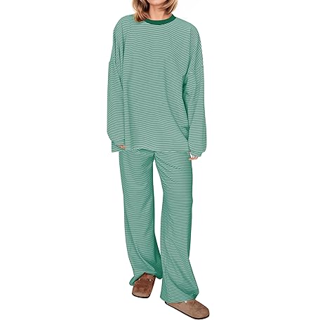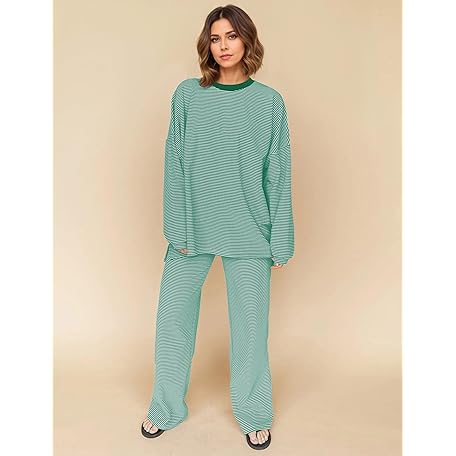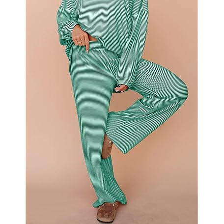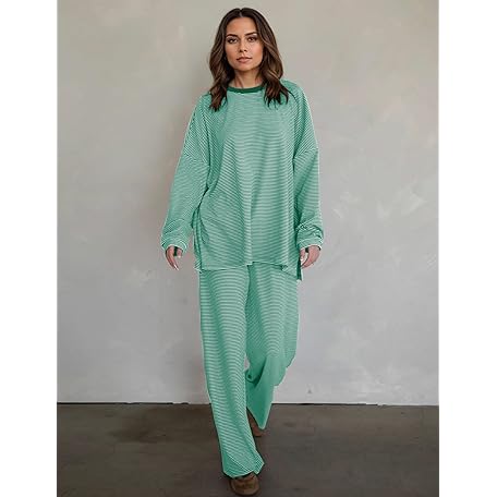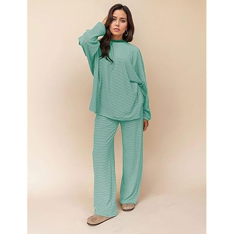 • MISSACTIVER Women's 2 Piece Striped Lounge Set Long Sleeve Oversized T-Shirt Wide Leg Pants Matching Pajamas Set