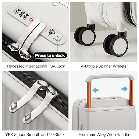 mixi Carry On Luggage 20'' Suitcase with Front Laptop Pocket, Wide Handle Rolling Travel Suitcases PC Hardshell with Aluminum Frame Spinner Wheels & TSA Lock, Carry-On Luggage(Smoke White)