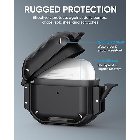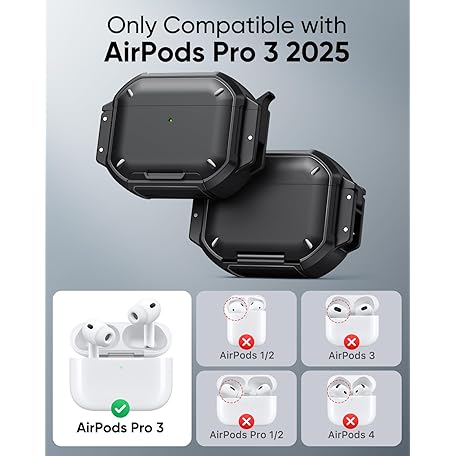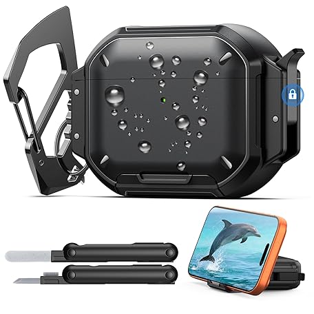 MoKo for AirPods Pro 3 Case with Lock & Metal Hook - IP68 Waterproof & Military-Grade Protection, Drop-Proof Hard Shell Protective Cover for AirPods Pro 3rd Gen with Cleaner Kit, Black