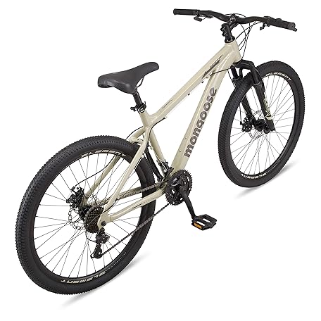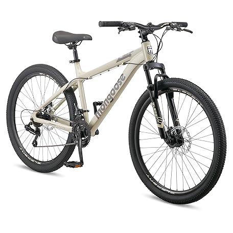Mongoose Grafton Mountain Bike, 24, 26 or 27.5 Inch Bike, 21 Speed, Aluminum Frame, Knobby Mountain Tires, Suspension Fork, Trigger Shifters, Mechanical Disc Brakes, Teal, Tan, Blue or Purple