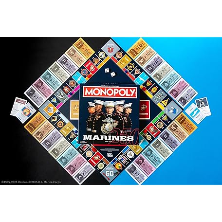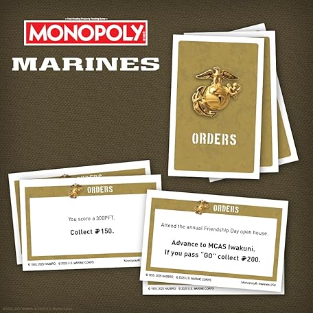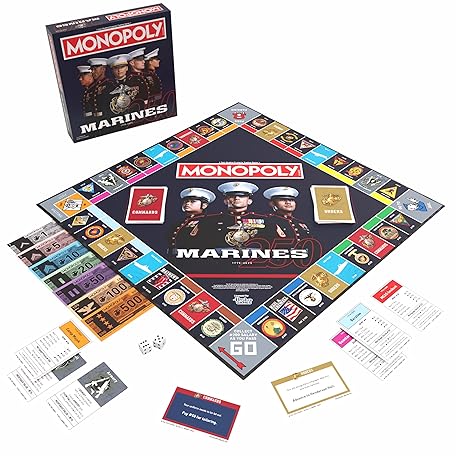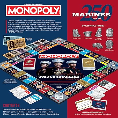 Thông tin sản phẩm Monopoly: Marines 250th Anniversary Edition, Celebrate 250 Years, Buy Bases Worldwide and Upgrade with Tents & Barracks, Play as Tokens: Combat Boots, Bulldog, & More, Officially Licensed Merchandise